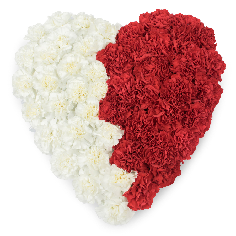 Introducing the Delicate Carnation Heart Arrangement from Handy Flowers, a lovely bouquet featuring a blend of white and red carnations. This heart-shaped display is perfect for expressing love, sympathy, and admiration with a touch of elegance.